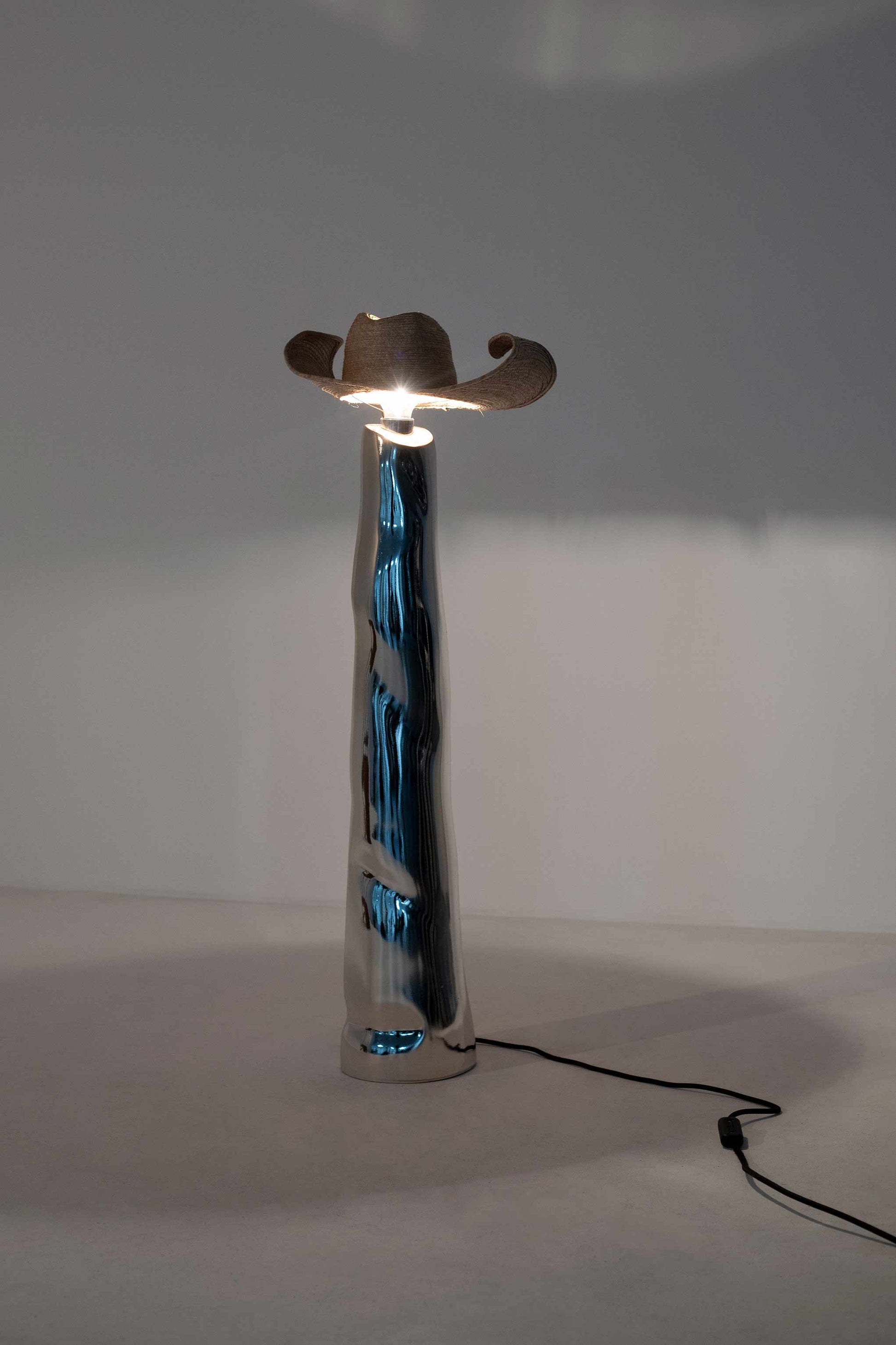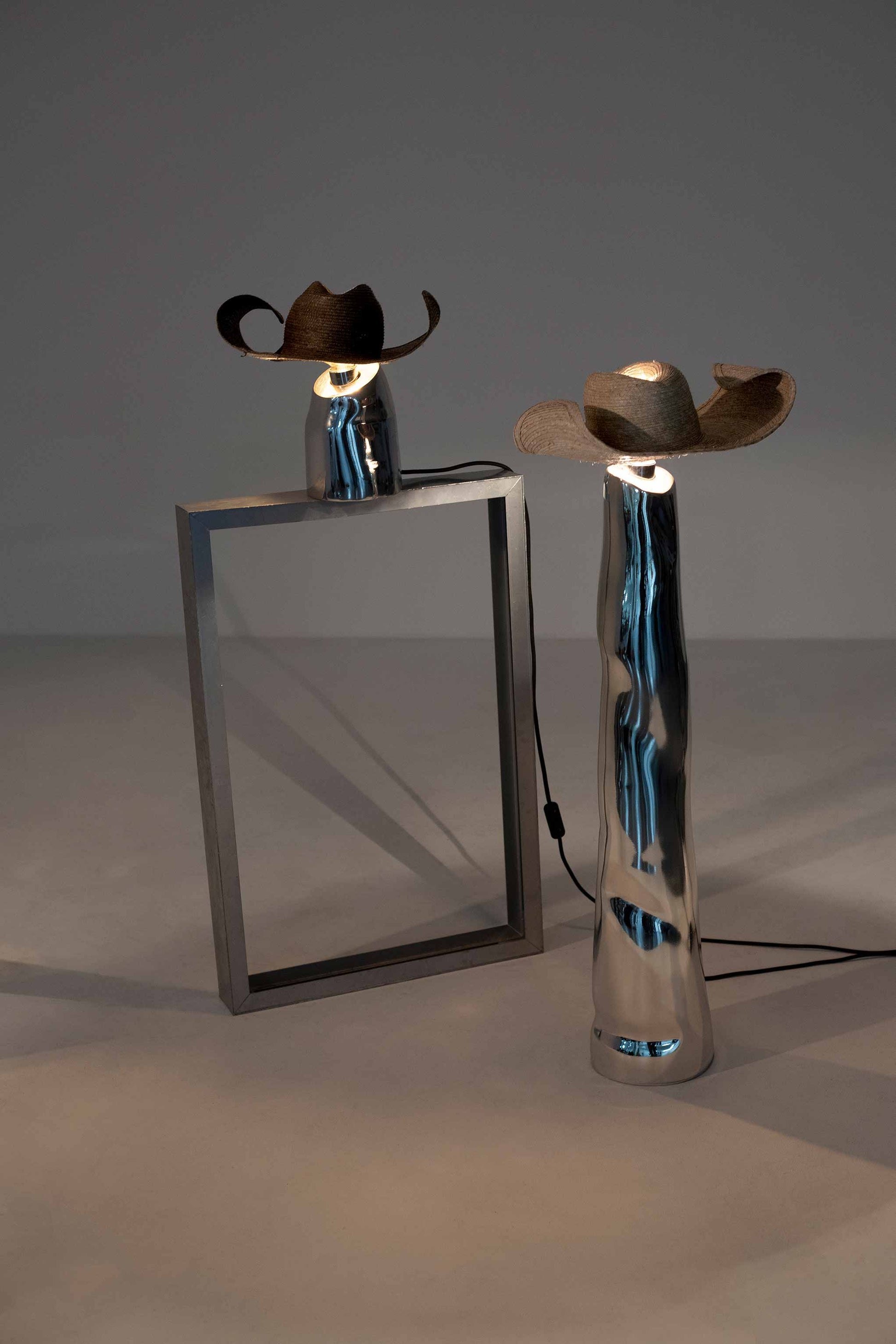 Introducing our Chrome Sombra Metal Floor Lamp, a derivative of our Warped Palm Leaf Sombrero. Available for pre-order, this creation blends time-honoured indigenous craftsmanship with modern design. Crafted by skilled artisans from Guatemala, this piece pays homage to the classic cowboy hat with a warped twist prominent in Eakin's work.