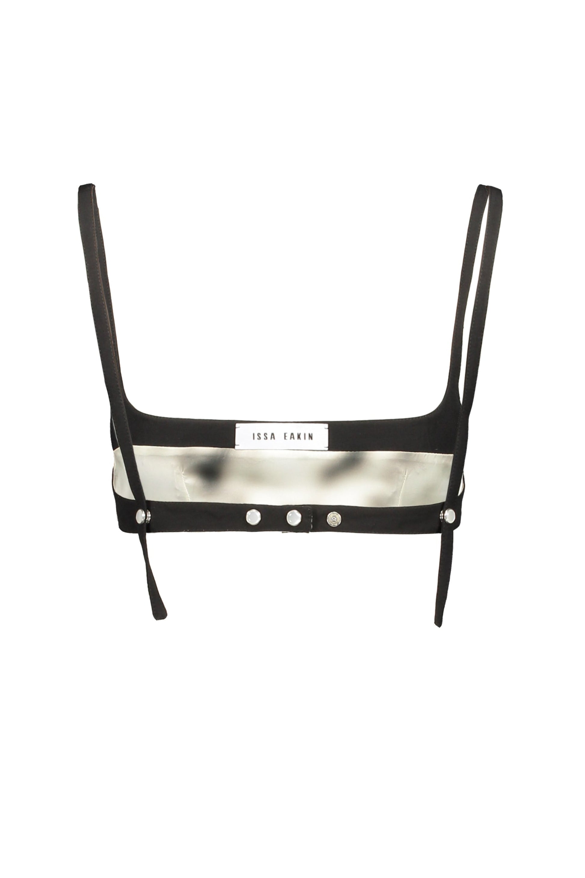 Horizontal Pearl Bar Bra – a versatile piece worn for lower bust exposure or layering over tops or dresses. Pearl snap closures on the back pay homage to the cowboy details that inspire our designs. This piece was designed as a layering item pulling inspiration from the designer's Guatemalan cowboy grandfather, known for his confident yet unconventional approach to layering intimate wear over his outerwear.