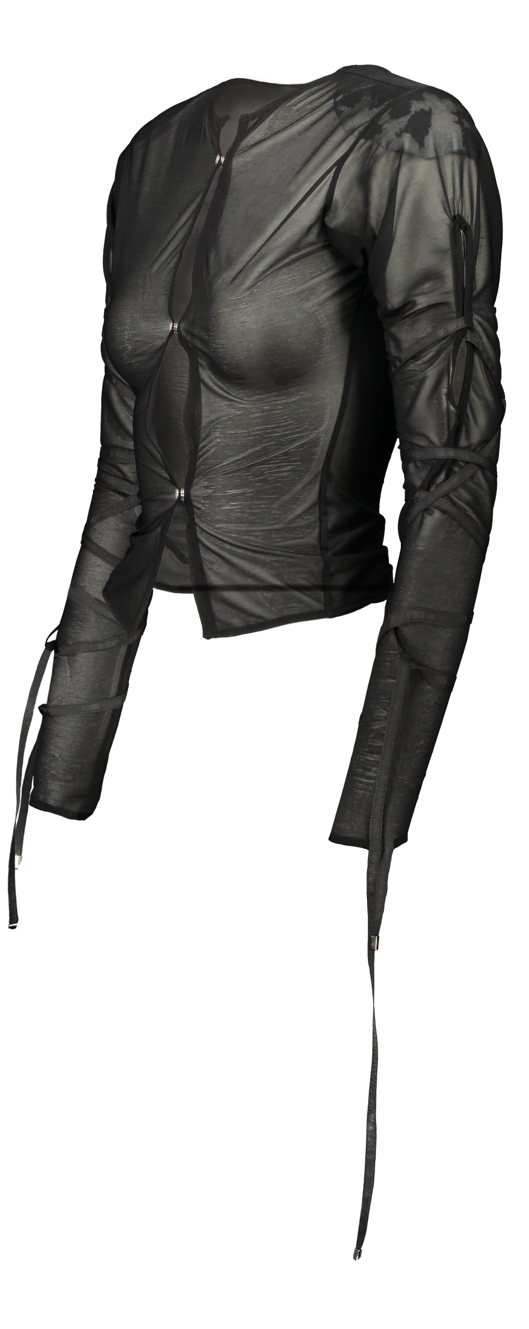 Sheer long-sleeve cardigan top features sleeve cut-outs with tie details. Dress sleeves open or twist-tied for a DIY approach to dressing. Cow print shoulder pads sit discreetly under slinky black knit fabric. Crisscross the ties down the arms, style with multiple bows, or twist-tie the slits as desired. Pearl snap buttons down the centre front pull influence from western cowboy styles.