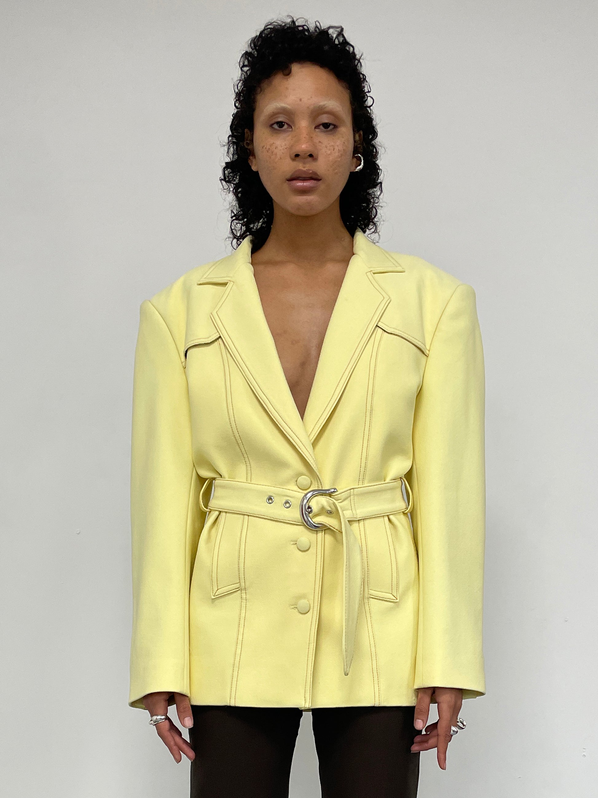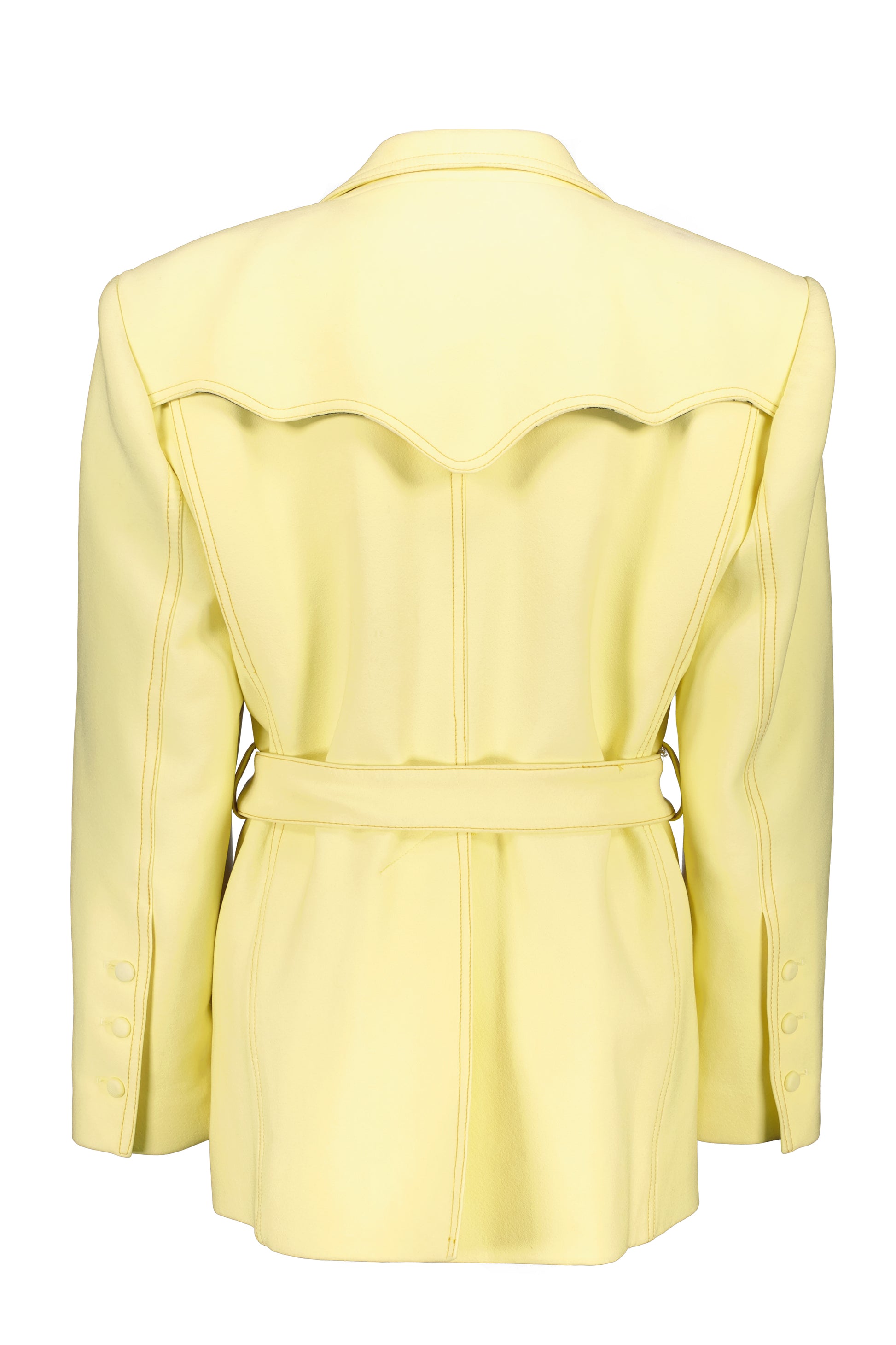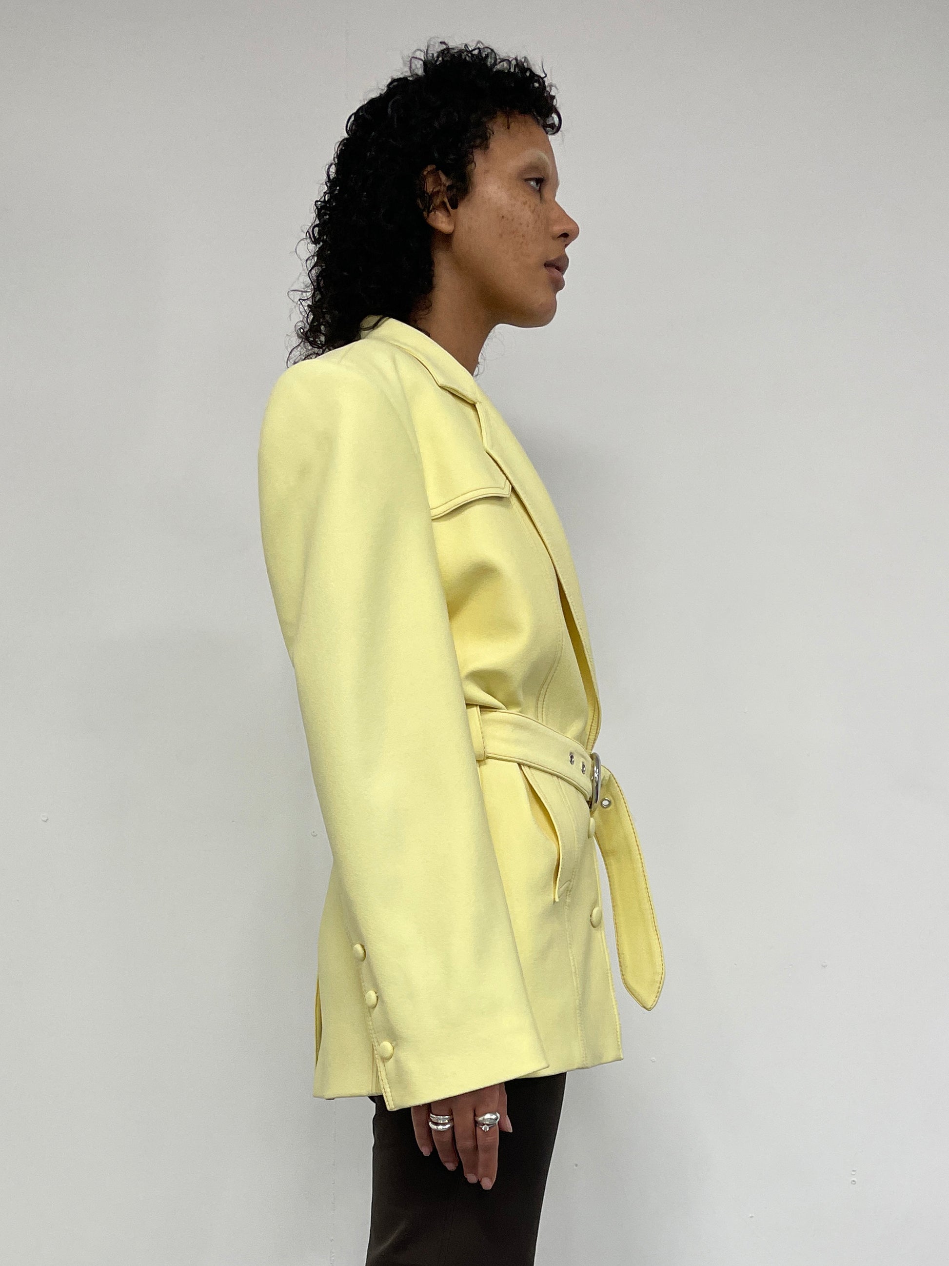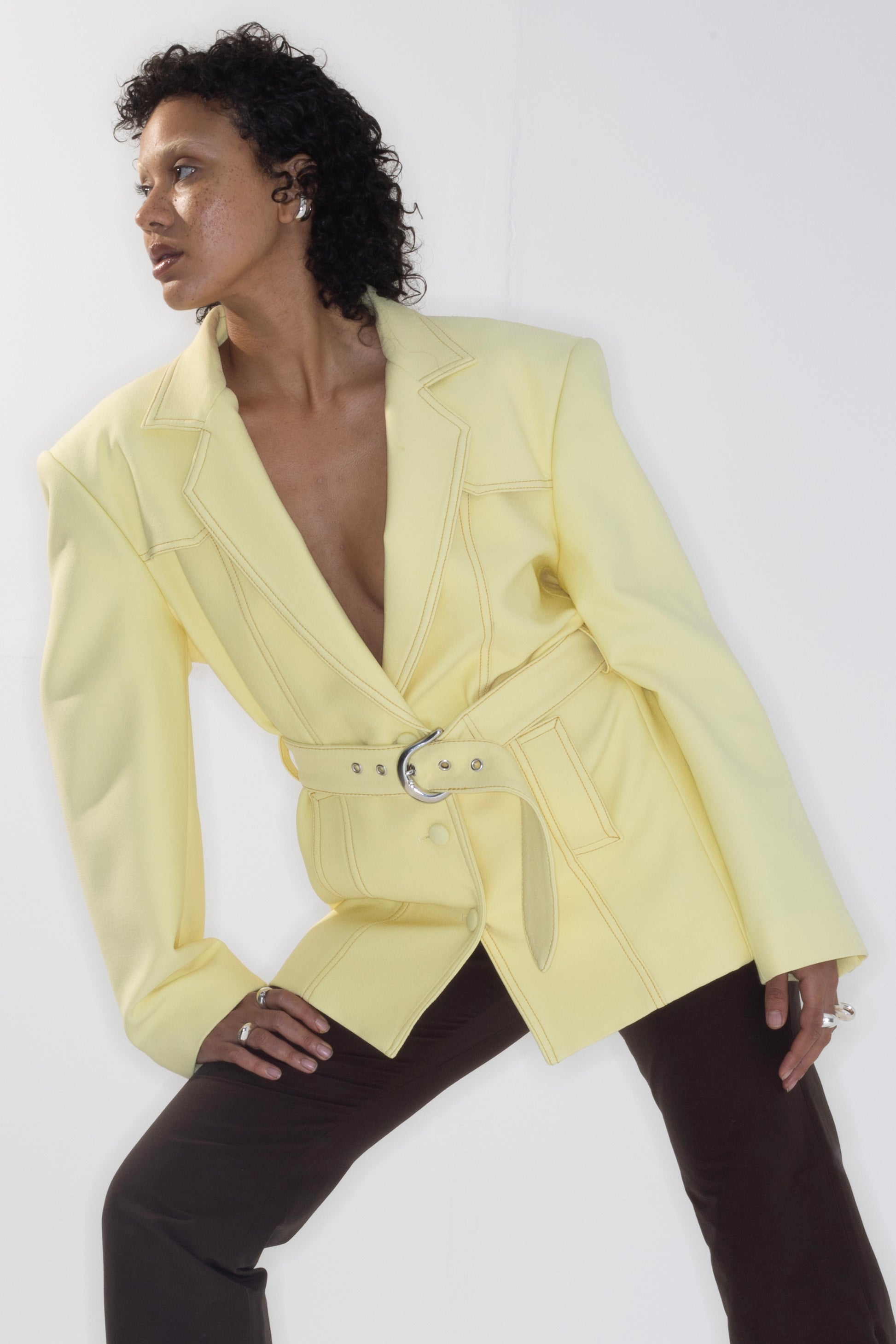 Classic Maxi suit jacket. Limited edition in our pastel champagne yellow. Single-breasted crossover closure. Strong oversized shoulder look. Welt pockets. Front and back storm flaps. Western topstitching details in a contrast denim style stitch. Set in Sleeve. Adjustable waist with a removable belt. Made in England.