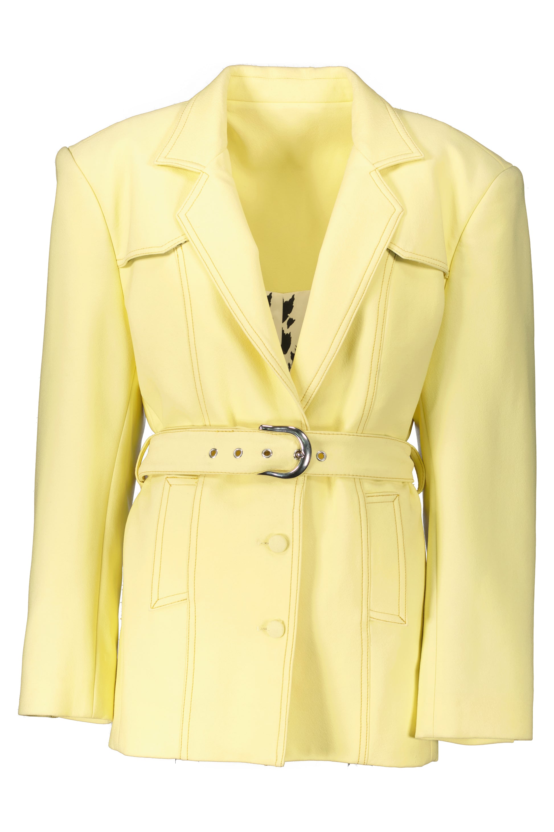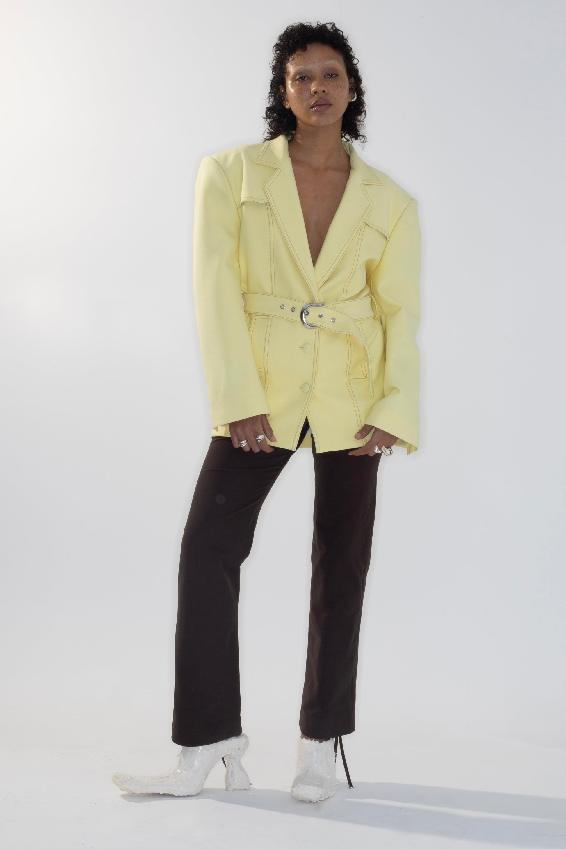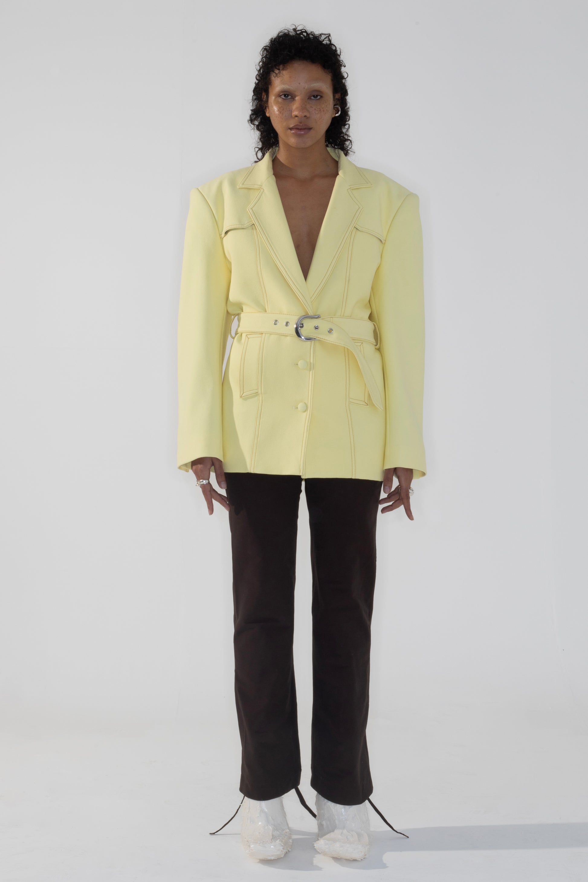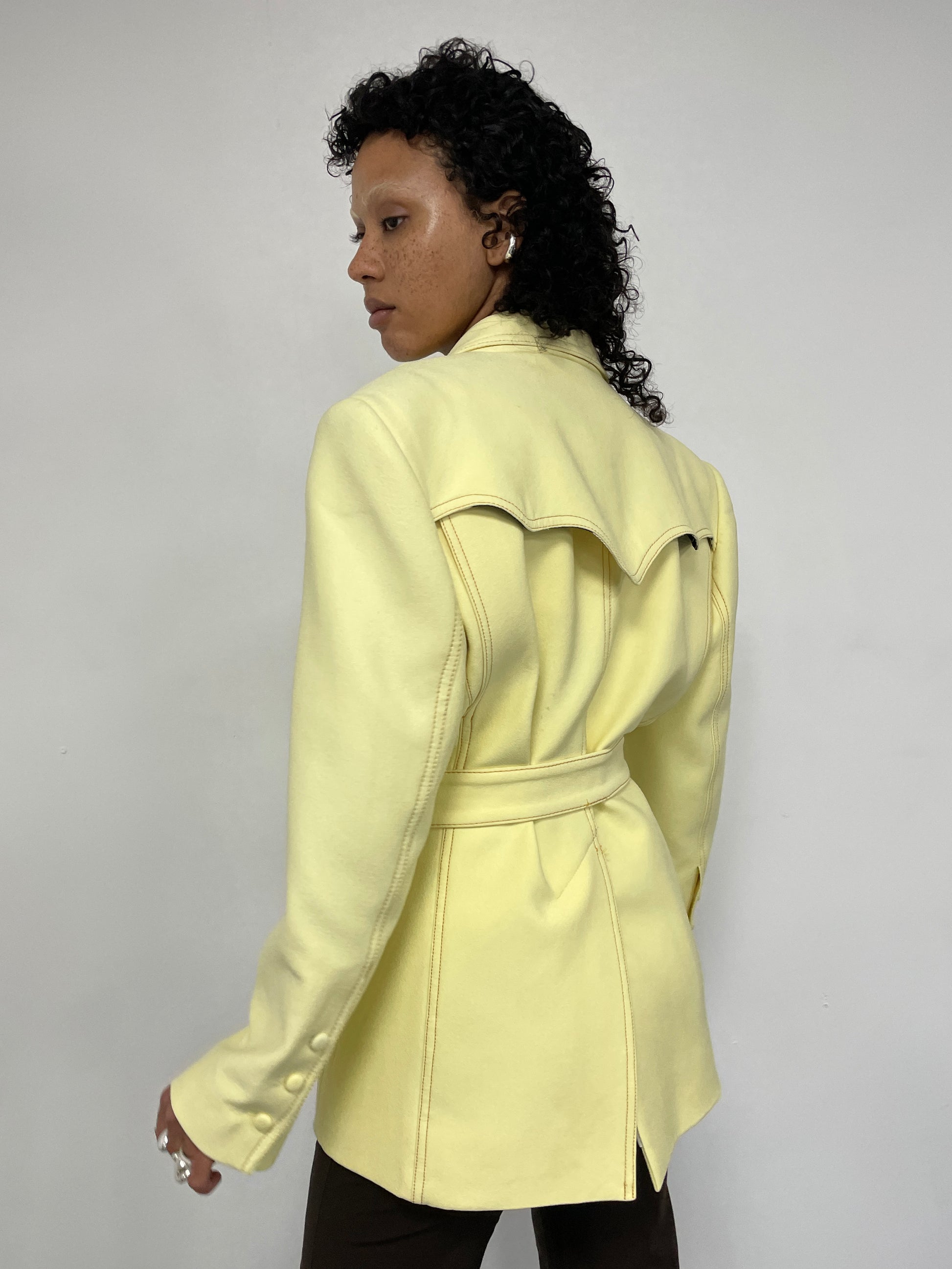 Classic Maxi suit jacket. Limited edition in our pastel champagne yellow. Single-breasted crossover closure. Strong oversized shoulder look. Welt pockets. Front and back storm flaps. Western topstitching details in a contrast denim style stitch. Set in Sleeve. Adjustable waist with a removable belt. Made in England.